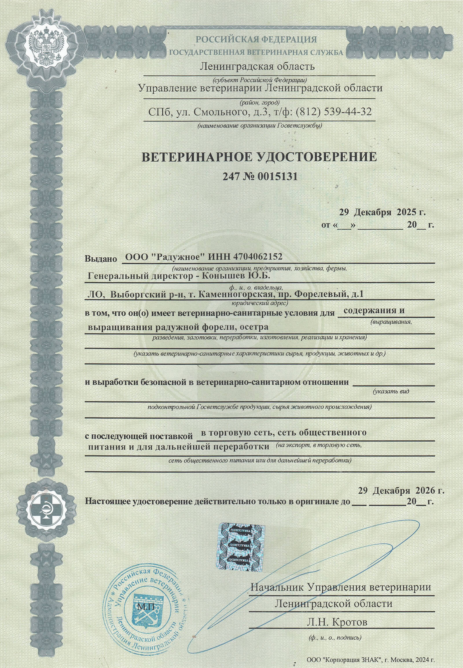 Ветеринарное удостоверение о содержании и выращивании радужной форели, осетра
